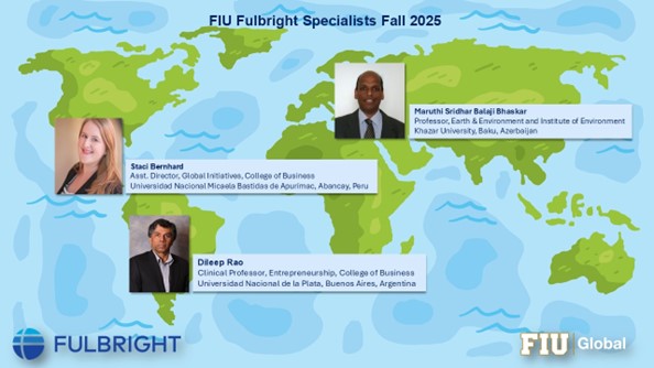 December 8, 2025 - this Fall, three FIU Fulbright Specialists led projects abroad highlighting FIU’s commitment to global engagement and capacity building. Maruthi Sridhar Balaji Bhaskar traveled to Azerbaijan to tackle water management issues; Dileep Rao trained entrepreneurial leaders in Argentina on developing a unicorn-entrepreneur ecosystem; and Staci Bernhard led university administrators in Peru through the process of developing their first internationalization strategy.